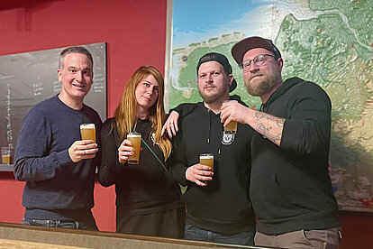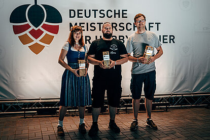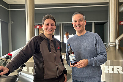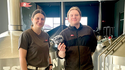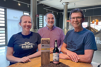 Dennis begrüßt die amtierenden Deutschen Meister der Hobbybrauer: Candy und Udo Sierks. Gemeinsam konnten sie sich im September 2022 mit ihrem Chocolate Stout als erstes Vater-Tochter-Duo diesen Titel sichern.