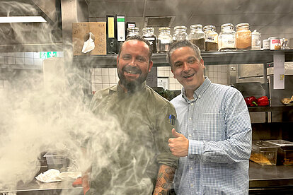 Dennis begrüßt seinen Elbphilharmonie-Kollegen Philipp Stapel. Er ist seit über einem Jahr als Chefkoch für Störtebeker in der Elbphilharmonie tätig und gibt Einblicke in seinen Job und seine Art der Rezeptentwicklung.