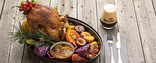 Ente in Orangensoße: ein Klassiker der Küche. Passend zu diesem Festtagsessen empfehlen wir unser samtweich-röstiges Schwarz-Bier.