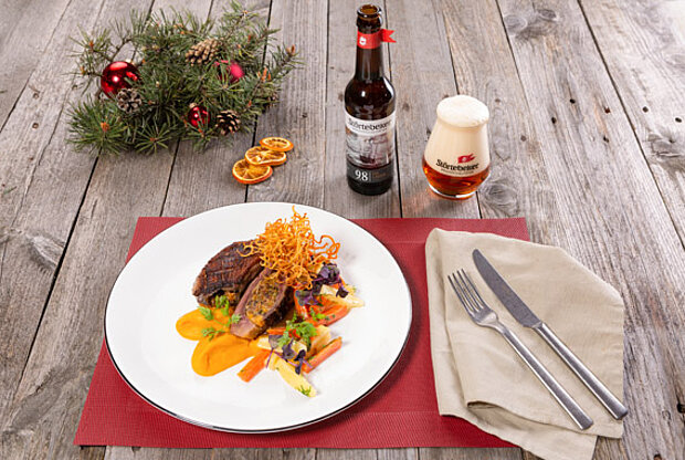 Ente, ein Klassiker zur Weihnachtszeit, gefüllt mit Dörrobst und serviert mit Wurzelgemüse. Dazu ein vollmundiges Baltik-Lager. Der perfekte Hauptgang in unserem Weihnachtsmenü.