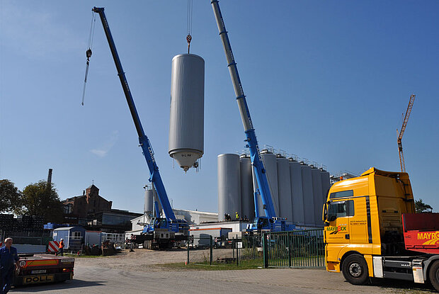 Zwei Mobil-Kräne sind nötig, um die 14 Meter hohen und 11,7 Tonnen schweren neuen Lagertanks für die Störtebeker Braumanufaktur auf Position zu heben. Die gute Entwicklung der Störtebeker Brauspezialitäten über die letzten Jahre haben diese Erweiterung möglich gemacht.