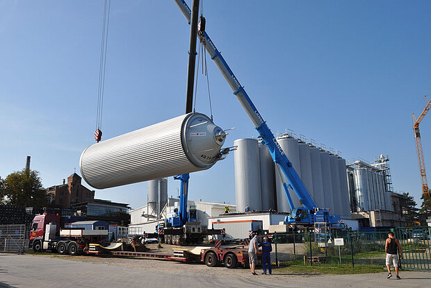 Während die Montage der neuen Malzsilos auf Hochtouren läuft, beginnt die nächste Etappe des Ausbaus: Mit Hilfe von zwei Kränen wurden vier neue Gär- und Lagertanks eingesetzt.