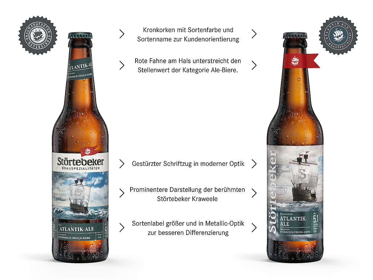 Besonders sichtbar wird der Relaunch bei den verschiedenen Sortenkategorien: Die fruchtig-herben Ale-Biere Atlantik-Ale, New England IPA und Pazifik-Ale treten künftig als eigenständige Familie auf und tragen die rote Fahne am Flaschenhals, die ihren besonderen Stellenwert innerhalb des Sortiments markiert.