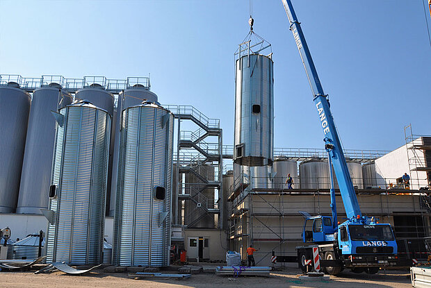 Die Montage der 16 Meter hohen Stahlblech-Behälter ist der nächste Schritt in der Erweiterung der Brauerei aus Stralsund. Die neuen Silos sollen die Logistik und die Verarbeitung des Malzes deutlich erleichtern.